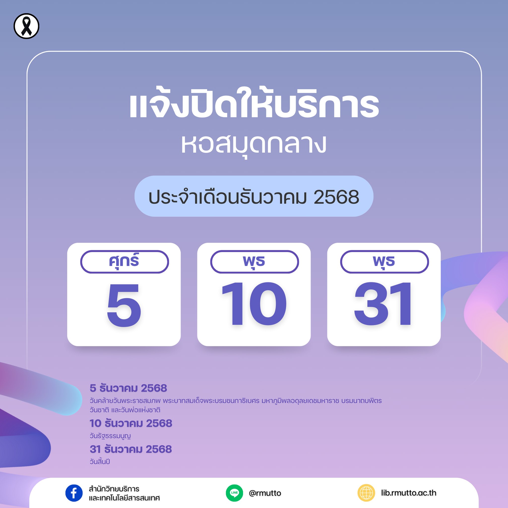 แจ้งปิดให้บริการ หอสมุดกลาง ประจำเดือนธันวาคม 2568
