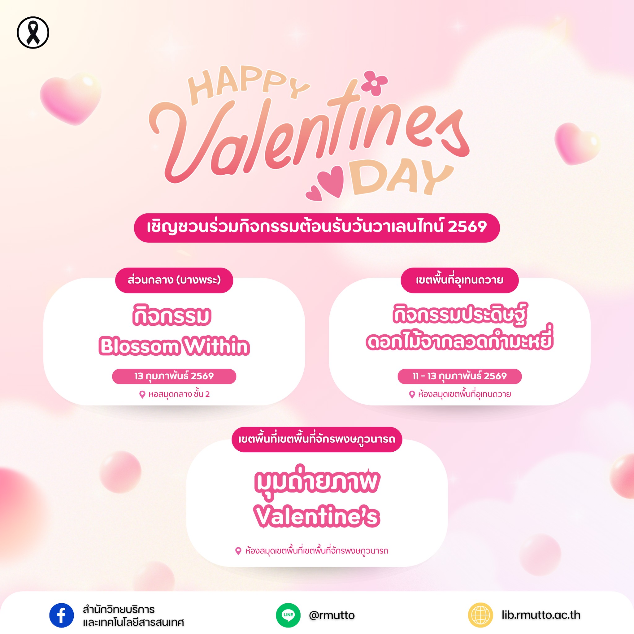 วาเลนไทน์ปีนี้… สำนักวิทยบริการและเทคโนโลยีสารสนเทศ มีกิจกรรมสุดคิ้วท์มาฝากทุกคนด้วยนะ ไม่ว่าจะอยู่เขตพื้นที่ไหน ก็แวะมาเติมความหวาน ฮีลใจไปกับพวกเราได้เลย!